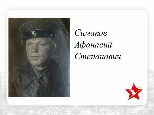 Когда я родилась, моего прадедушуи уже не было, но мне всегда рассказывала о нём моя бабушка-его дочь. Афанасий Степанович не любил говорить про войну, поэтому мы не много знаем о годах, которые он провёл на войне, но мы можем догадываться о подвигах, которые он совершил, по его многочисленным наградам, среди которых Орден Красной Звезды и Орден Ленина. Прадедушка прошёл через всю войну, но был ранен только тогда, когда война была побеждена, и солтад везли по домам. Машина, в которой ехал Афанасий Степанович, наехала на мину и прадедушка получил контузию и ранение в ногу.