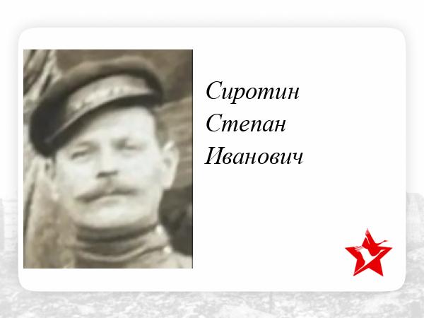 Сиротин Степан Иванович родился 15 апреля 1894 года в посёлке Усть-Катавский завод Усть-Катавской волости Уфимского уезда Уфимской губернии Российской империи. Беспартийный. Во время Первой мировой войны 1914-1918 гг. служил матросом Российского императорского флота на Балтийском флоте, г. Петроград. Трудился землекопом 3 дистанции пути Южно-Уральской железной дороги НКПС СССР до 17 апреля 1941 года. Во время Великой Отечественной войны 1941-1945 гг. трудился в г. Новоказалинск Казахской ССР, СССР. Умер 20 ноября 1977 года.