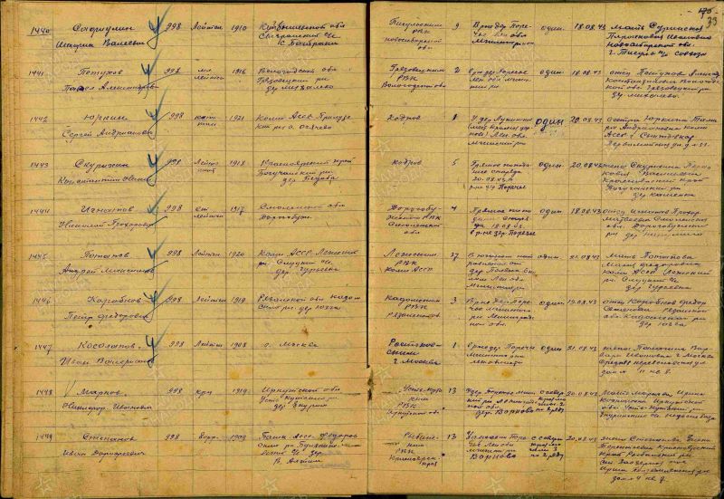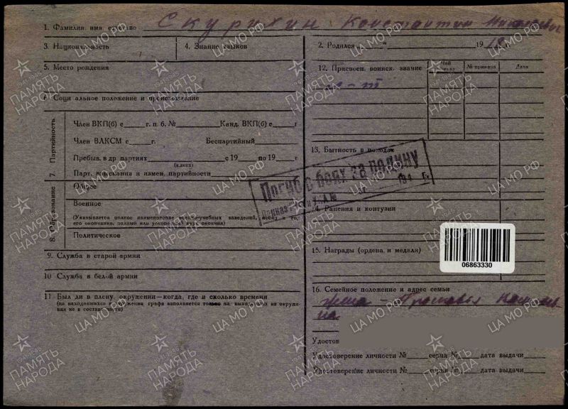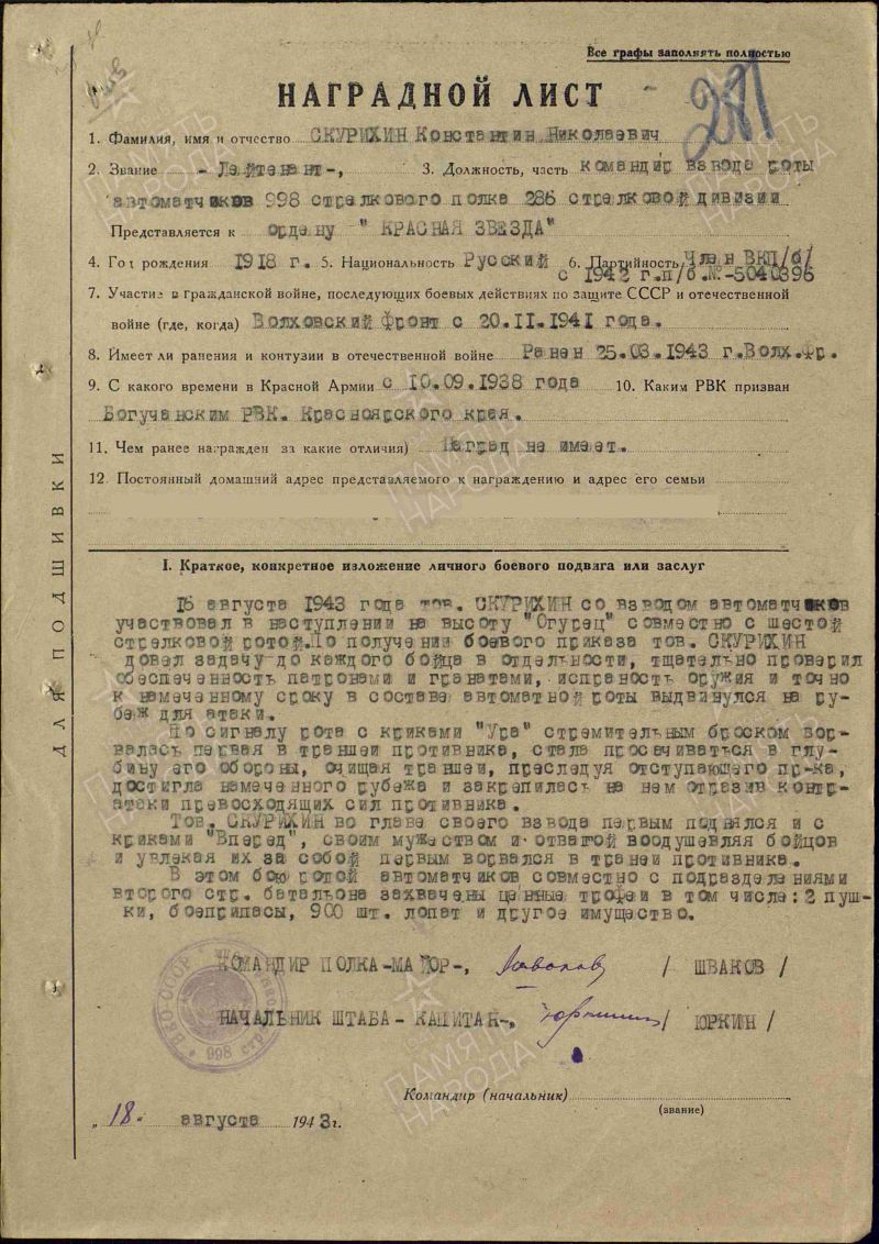 Скурихин Константин Николаевич, 1918 г. р. Место рождения Красноярский край, Богучанский район, д. Бедоба. Призван Богучанским РВК в 1938 году. Лейтенант. Командир взвода автоматчиков. Член ВКП б с 1942 года. В/ч 998 сп 286 сд. Ранен 25.03.1943 года. Награждён медалью За отвагу ( 19.08.1943). Последнее письмо родные получили от 18.08.1943 года. В 1947 году отец, Скурихин Николай Филонович, подавал заявление на розыск сына. В 1948 году признан Пропавшим без вести в декабре 1943 года. Скурихин К. Н. убит 20.08.1943 года прямым попаданием снаряда. Похоронен Ленинградская область, Мгинский район,, д. Поречье, в районе, одиночная могила 5. Жена Скурихина Прасковья Васильевна.