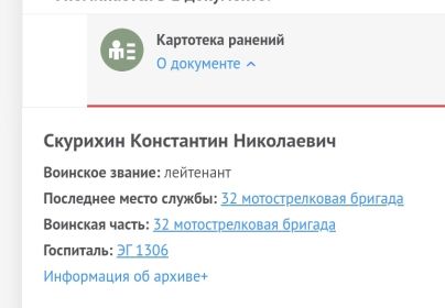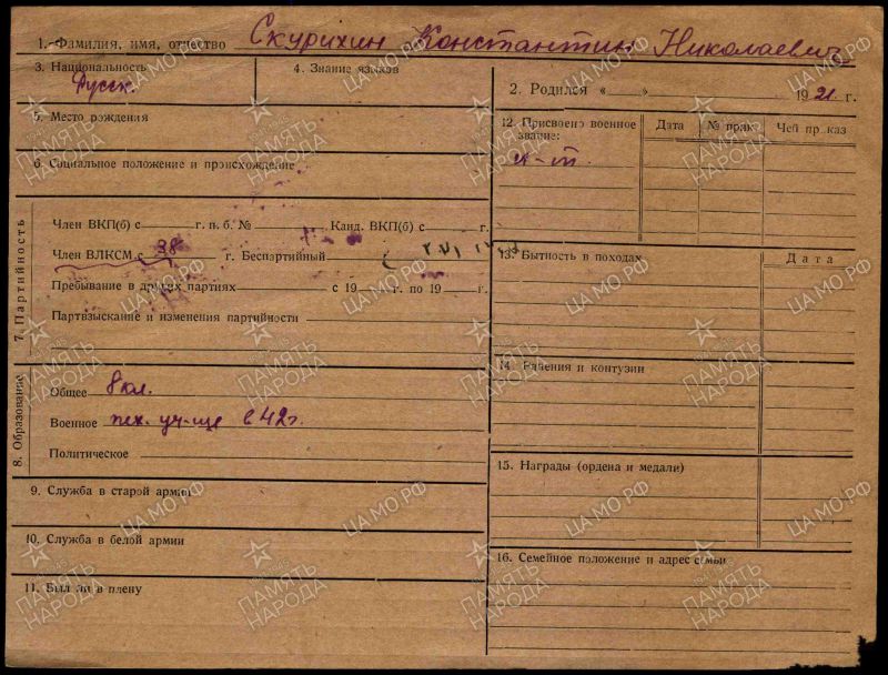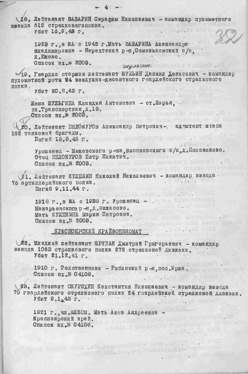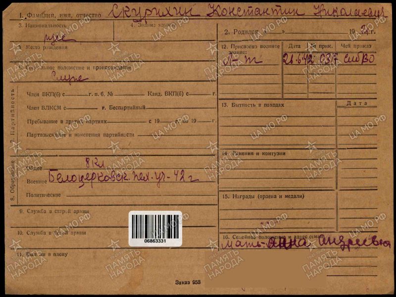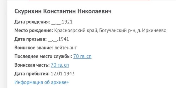 Скурихин Константин Николаевич, 1921 г. р. Место рождения Красноярский край, Богучанский район, д. Иркинеево. Призван Богучанским РВК в 1941 году. Окончил Белоцерковское ВПУ в 1942 году. Лейтенант. Командир взвода. В/ч 33 мсбр. Ранен в 1942 году. ЭГ 1306(по справочнику Солдат. ру дислокация г. Саратов). После излечения в/ч 70 гв. сп 24 гв. сд. Убит в бою 9.01.1943 года. Место захоронения не указано. Дивизия вела бои в Ростовской области. Мать Скурихина Анна Андреевна.
