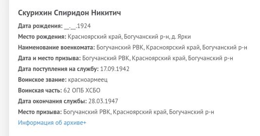 Скурихин Спиридон Никитович, 1924 г. р. Место рождения Красноярский край, Богучанский район, д. Ярки. Призван Богучанским РВК в 1942 году. Краснофлотец. Стрелок. В/ч 62 опб ХС БО ТОФ. Участник войны с Японией. Дата окончания службы 28.03.1947. Умер в 1978 году.
