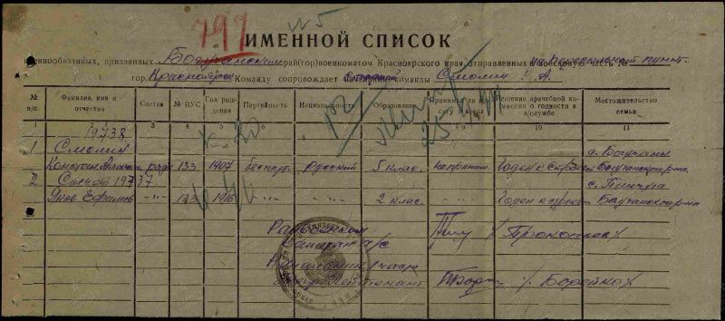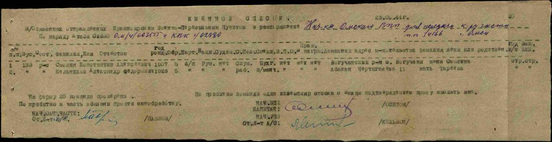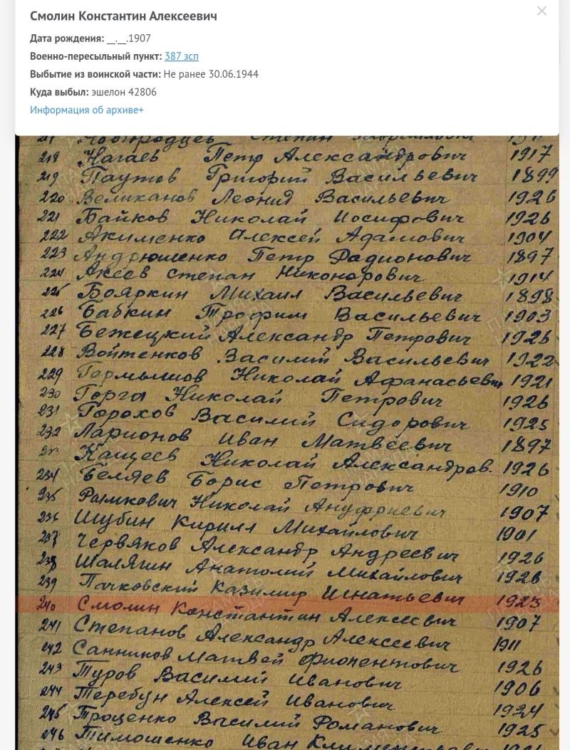 Смолин Константин Алексеевич, 1907 г. р. Место рождения Красноярский край, Богучанский район, с. Богучаны. Призван Богучанским РВК в 1944 году. Красноармеец. Стрелок. В/ч 387 зсп 39 зсд. В сентябре 1944 года выбыл на фронт. Документов о дальнейшей судьбе на сайте Память народа нет.