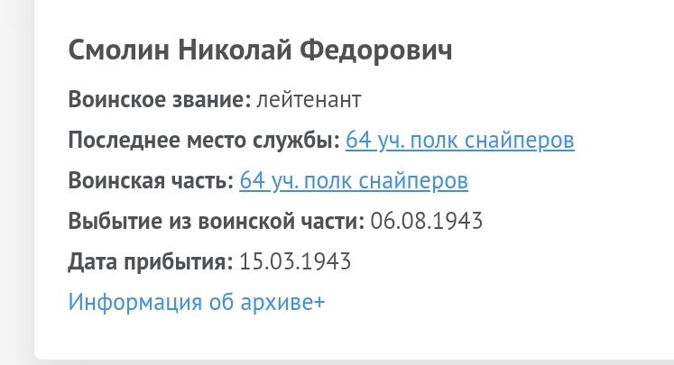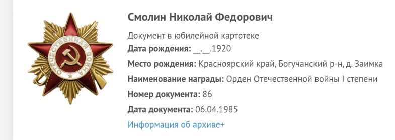 Смолин Николай Фёдорович, 1920 г. р. Место рождения Красноярский край, Богучанский район, д. Заимка. Призван Богучанским РВК в 1940 году. Красноармеец. Стрелок-снайпер. Участник Сталинградской битвы. В/ч 64 учёный полк снайперов 10 уч. сбр. Награждён юбилейным орденом Отечественной войны 1 степени. Мать Смолина Анна Прохоровна.