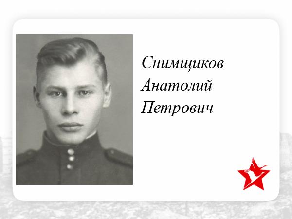 Родился 06.03.1924г. в Москве.Детство и юность прошли в г.Магнитогорске,куда переехала семья.Место призыва-Магнитогорский РВК.В декабре 1942г. стал курсантом 1-ого Ростовского артиллерийского училища,где проходил обучение по профилю "командир огневого взвода".По окончании училища 10.43г. в звании младший лейтенант направлен на фронт В составе 682 стрелкового полка 202 стрелковой дивизии воевал на 1-ом и 2-ом Украинском фронте.Был командиром взвода 45 мм противотанковых пушек. Участвовал в Корсунь-Шевченковской битве,Умано-Ботошанской,Ясско-Кишиневской операциях,воевал на территории Румынии,Венгрии,форсировал реки Днестр,Прут.За исключительно умелое маневренное использование противотанковых орудий в сложной боевой обстановке,за отвагу и мужество,проявленное при этом удостоен правительственной награды-ордена Красная Звезда. Запись в наградном листе 35/н от 05.11.44 : Тов.Снимщиков в боях при прорыве обороны 20.08.44г. в районе дер.Ербичени Ясского уезда (Румыния),будучи командиром взвода батарей 45мм пушек уничтожил огнем из пушек своего взвода 4 пулемета и 1 противотанковую пушку противника ,которые мешали наступлению нашей пехоты. Во время боев на границе Трансильвании тов.Снимщиков одним из первых переправил свои пушки через водный рубеж и повел бой с контратакующими самоходными орудиями немцев,подбив взводом 1 из них и заставив остальных уйти обратно.Контратака противника была отбита. 30 декабря 1944 г. получил осколочное ранение и был эвакуирован в госпиталь №1 г. Еревана,где и встретил долгожданный День Победы.Этот праздник стал главным праздником на всю жизнь. После войны успешно окончил драмстудию при Магнитогорском драмтеатре им А.С.Пушкина,играл в спектаклях,но вынужден был отказаться от актерской карьеры и по набору приехал в Челябинск-40 (ныне Озерск).С отличием окончил Политехникум (Южно-Уральский) и всю жизнь проработал инженером-конструктором на химкомбинате "Маяк". Был умным,талантливым,добрым и порядочным человеком.Прекрасно пел,рисовал,читал стихи. Награды-орден Красная Звезда,орден Отечественной войны 1 ст.,медаль За победу над Германией в Великой Отечественной войне 1941-1945 гг, юбилейные медали, награды за трудовые достижения. Умер 19.03.2003г. в Озерске. Наша семья любит,помнит,чтит и гордится своим отцом,дедом и прадедом.