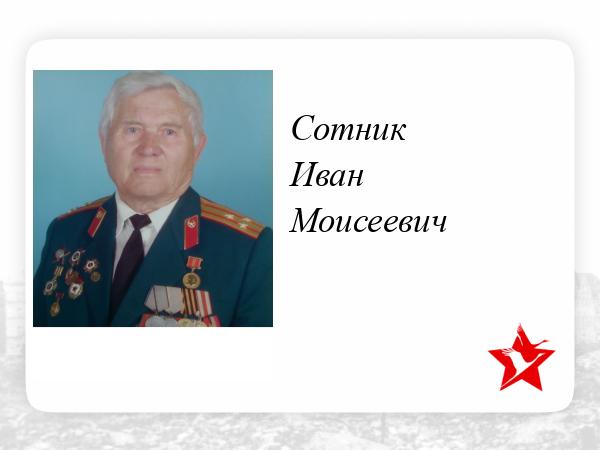 В декабре 1940 года был призван в Вооружённые Силы, а в звании Лейтенанта с февраля 1943 года на Воронежском фронте участвовал в тяжелейших боях на Курской дуге, при подходе к Днепру тяжело ранен. После 6 месяцев госпиталя снова в строю, командовал маршевой ротой. Окончил высшие курсы «Выстрел», в течение года являлся советником Народной армии ГДР. С 1960 года занимал должность Юхновского райвоенкома, служит в обл военкомате. Демобилизован в 1974 году. Полковник в отставке Сотник И.М член областного и городского Совета ветеранов войны и труда. Награждён орденами Отечественной войны 1 степени, Красной звезды, медалями «За отвагу», «За боевые заслуги»
