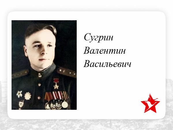 К 10 сентября 1943г. совершил 22 боевых вылета, 18 из которых с оценкой «отлично». 27 раз был обстрелян зенитными средствами противника. Приказом от 04 ноября 1943г. гвардии лейтенант Сугрин был награжден орденом Красного Знамени.