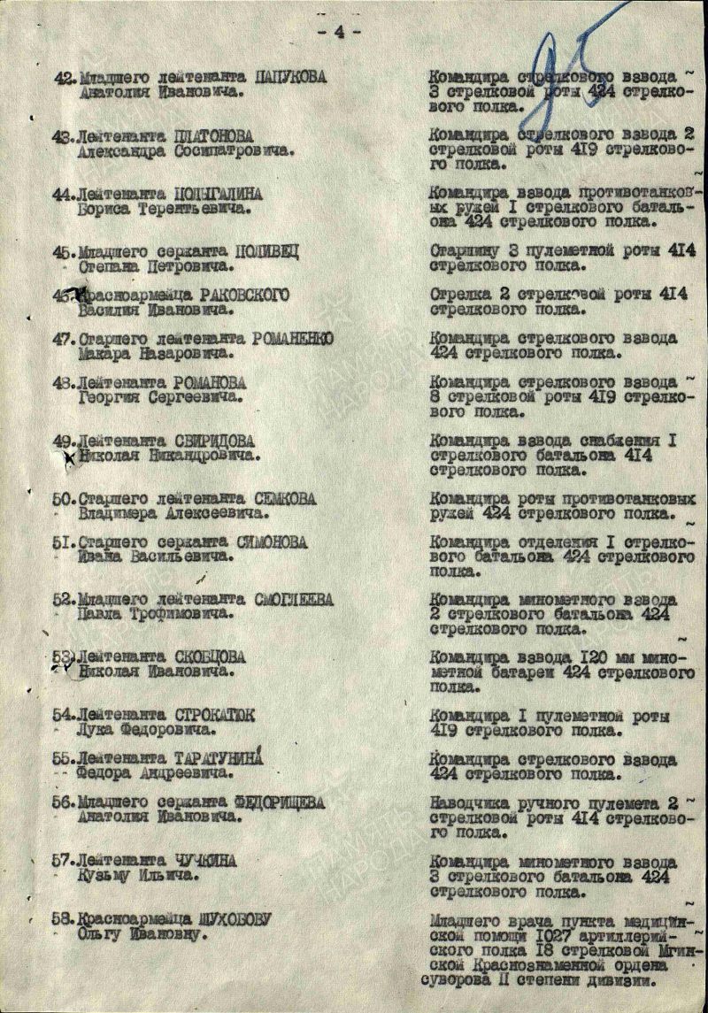 Командовал стрелковым взводом 424 стрелкового полка (Игигнской Краснознаменной ордена Суворова 2 степени дивизии 2 Белорусского фронта).