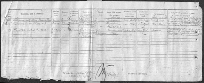Из архивной справки Архива военно-медицинских документов 25 января 1943 года получил касательное ранение мягких тканей левой щеки и правой половины шеи, ушиб левого глаза, находился в МСВ 138 ос бр с 25.01.43г., ППГ 737 с 26.01.43г., СЭГ 2222 с 27.01.43г.(сортировочный эвакогоспиталь Ленинград-67, п/я 25, ул.Куракина 1/3), ЭГ 1117 с 27.01.43г. (эвакогоспиталь Ленинград, Пироговская наб, 3, ппс 394). С 27 марта по 17 апреля 1943г. находился на излечении в ЭГ 3158 г.Котельнич Кировской обл (эвакуационный госпиталь). Выбыл по выздоровлении в Котельничский РВК, годным к строевой службе. Женой в документах указана Фатеева Дарья Илларионовна (по девичьей фамилии).