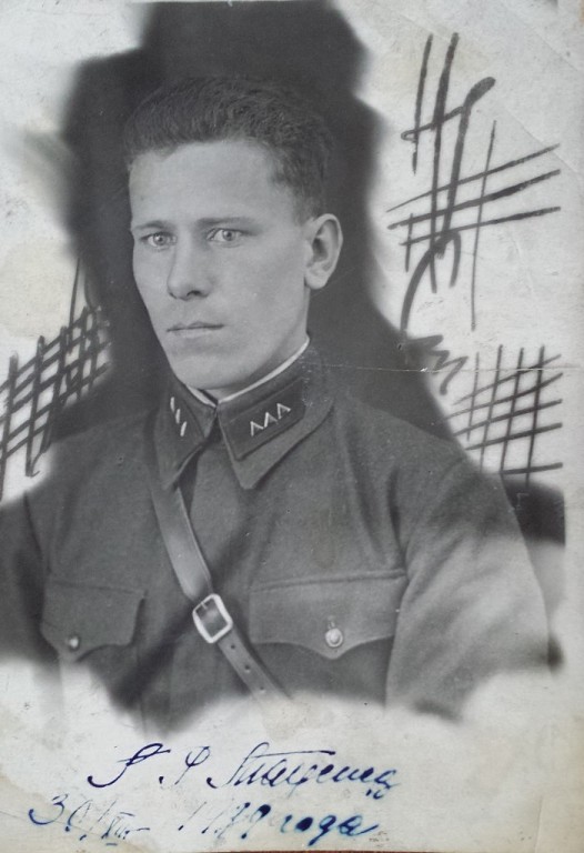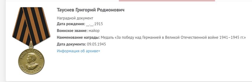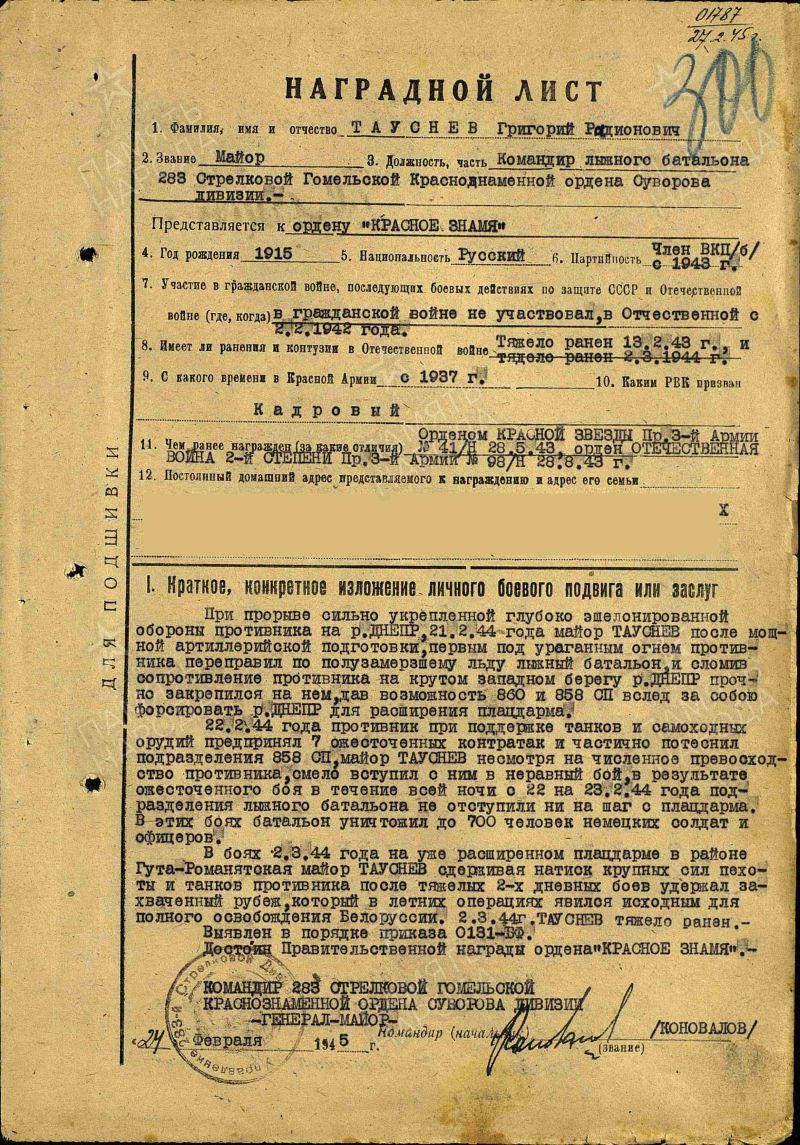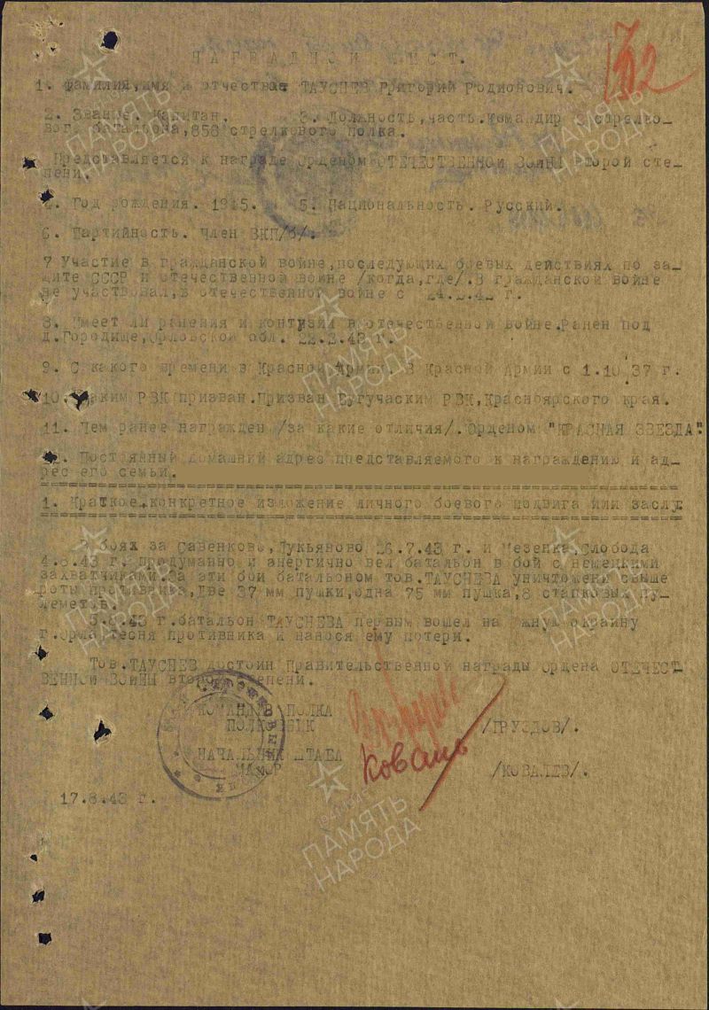 Тауснев Григорий Родионович, 1915 г. р. Место рождения Красноярский край, Богучанский район, д. Ярки. Призван Богучанским РВК 8.10.1937 года. В 1940 году окончил курсы мл. лейтенантов. Младший лейтенант. Командир лыжного взвода. В/ч 235 олб., 225 олб./ Капитан. Командир лыжного батальона. Политрук. В/ч 613 сп 91 сд., 858 сп 283 сд. Член ВКП б с 1943 года. Ранен 22.03.1943 года. Тяжело ранен 13.02.1943 года и 2.03.1944 года. Награждён орденом Красной Звезды, орденом Отечественной войны 2 степени, медалью За Победу над Германией в Великой Отечественной войне 1941-1945 гг., орденом Красного Знамени, юбилейным орденом Отечественной войны 1 степени. Дата окончания службы 9.02.1946 года. Звание Майор. Умер в 1987 году. Жена Безруких Любовь Константиновна, сыновья Валентин и Владимир.