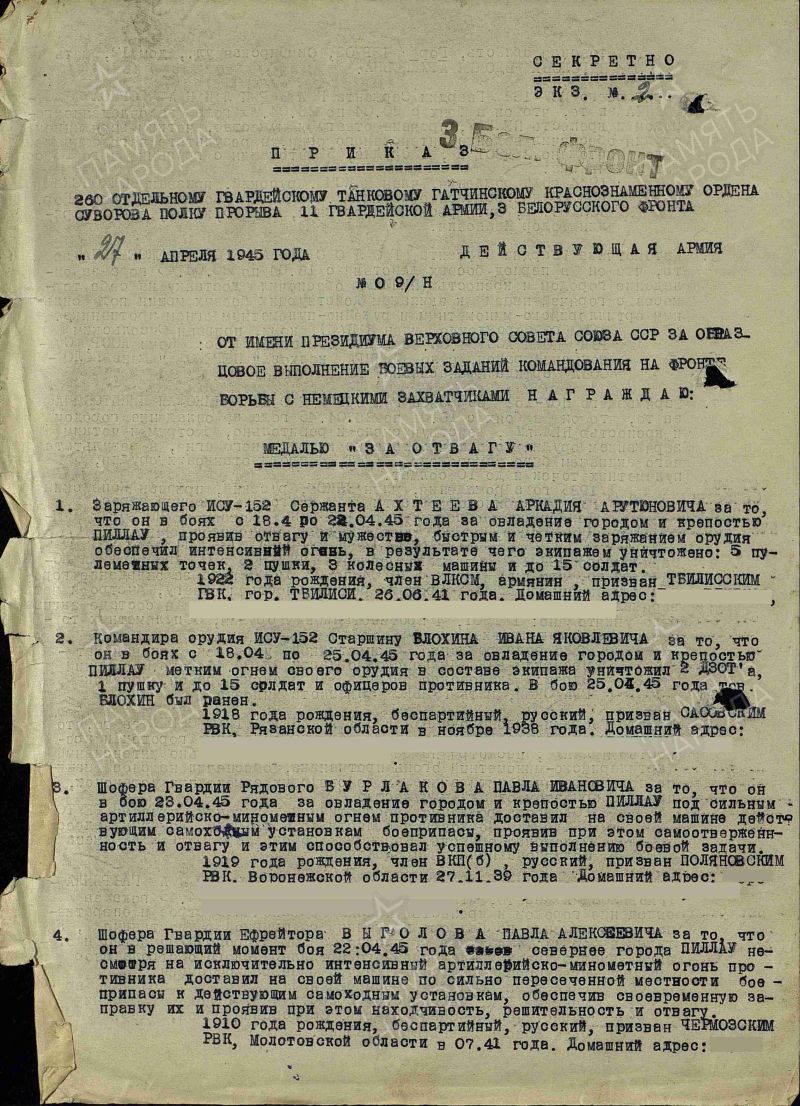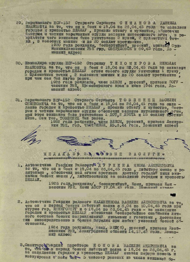 Тихомиров Николай Иванович, 1926 г. р. Место рождения Приморский край, г. Владивосток. До войны жил в Красноярском крае, Богучанский район, с. Богучаны. Призван Богучанским РВК в 1944 году. Гв. старшина. Командир орудия. В/ч 260 отпп 3 гв. А. Награждён медалью За оборону Ленинграда, медалью За отвагу, медалью За взятие Кёнигсберга, медалью За Победу над Германией в Великой Отечественной войне 1941-1945 гг., юбилейным орденом Отечественной войны 1 степени. Мать Тихомирова Екатерина Сергеевна, брат, пять сестер.