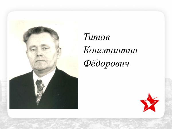 Титов Константин Федорович после демобилизации по ранению проходил лечение на родине в г. Владимир. Рана в результате тяжёлого ранения закрылась только в 1956 году. Несмотря на это Константин Федорович, в 1947 году окончил Владимирский Машиностроительный техникум. После окончания поступил на работу на Владимирский тракторный завод , где и проработал до выхода на пенсию в 197 по инвалидности , в должности начальника ШИХа тракторо - сборочного цеха главного конвейера. Награждён медалью " За победу над Германией" и юбилейными медалями. У Константина Федоровича две дочери 1948 и 1955 годов рождения.