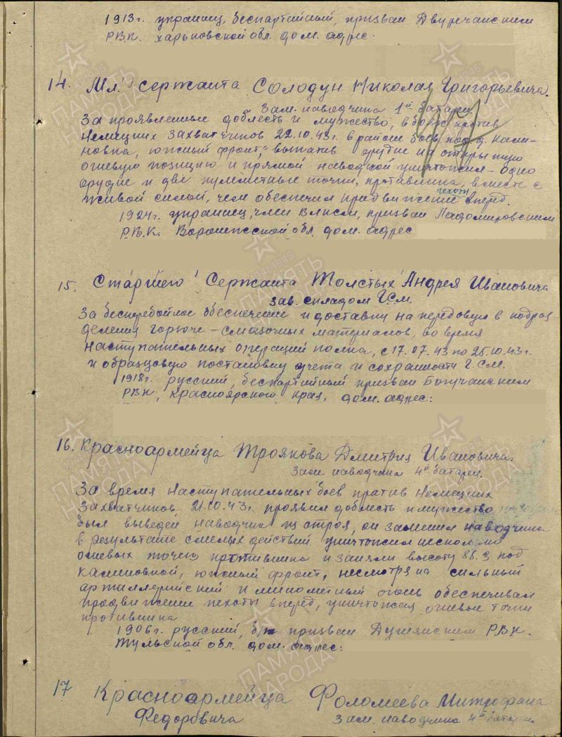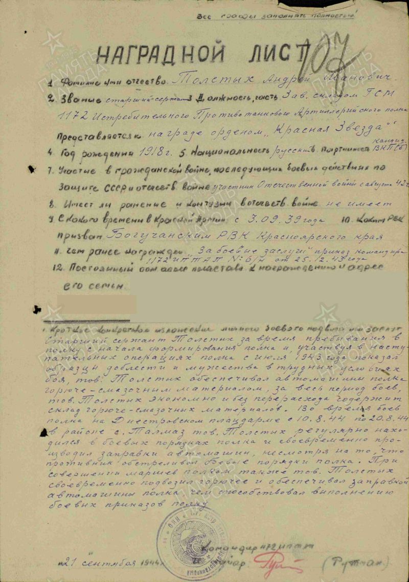 Толстых Андрей Иванович, 1918 г. р. Место рождения Красноярский край, Богучанский район, д. Пинчуга. Призван Богучанским РВК в 1939 году. Старший сержант. Зав. складом ГСМ. В/ч 1172 иптап 9 оиптабр РГК. Награждён медалью За боевые заслуги, медалью За отвагу, медалью За Победу над Германией в Великой Отечественной войне 1941-1945 гг., медалью За взятие Будапешта, юбилейным орденом Отечественной войны 2 степени. Умер в 1986 году.