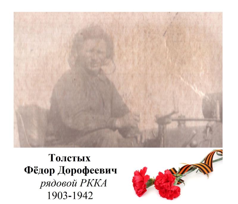 Толстых Фёдор Дорофеевич, 1903 г. р. Место рождения Красноярский край, Богучанский район, д. Пинчуга. Призван Богучанским РВК в январе 1942 года. Красноармеец. Стрелок. Последнее письмо родные получили в марте 1942 года из Красноярска. Пропал без вести в июне 1942 года. Жена Толстых Анна Петровна.