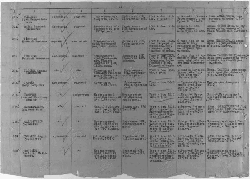 Толстых Филипп Семёнович, 1903 г. р. Место рождения Красноярский край, Богучанский район, д. Пинчуга. Призван Богучанским РВК в январе 1942 года. Красноармеец. Стрелок. В/ч 1054 сп 301 сд. Участник Курской битвы. Убит в бою 12.05.1942 года. Похоронен Курская область, Шебекинский район, д. Ржавец, мог. 3. Перезахоронен Белгородская область, Шебекинский район, п. Маслова Пристань, братская могила 39.