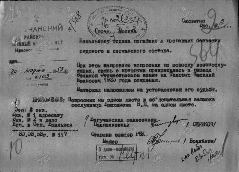 В 1953 году мать, Толстых Манефа Ивановна, подавая заявление на розыск сына писала, что письменная связь с ним прекратилась в июне 1944 года. К заявлению приложена объяснительная односельчанина Брюханова Николая Александровича, встречавшего Толстых В. И. в июле 1944 года в Карелии, ехавшего на машине в сторону фронта, в направлении п. Салми.