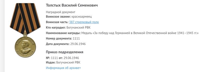 Толстых Василий Семёнович, 1897 г. р. Место рождения Красноярский край, Богучанский район, с. Богучаны. Призван Богучанским РВК 10.08.1942 года. Красноармеец. Пулемётчик. В/ч 387 зсп, 282 сд 34 А. Прибыл на фронт 25.04.1943 года. Тяжело ранен в ногу. Инвалид войны. Награждён медалью За Победу над Германией в Великой Отечественной войне 1941-1945 гг. Жена Толстых Устинья Филипповна, детей трое.