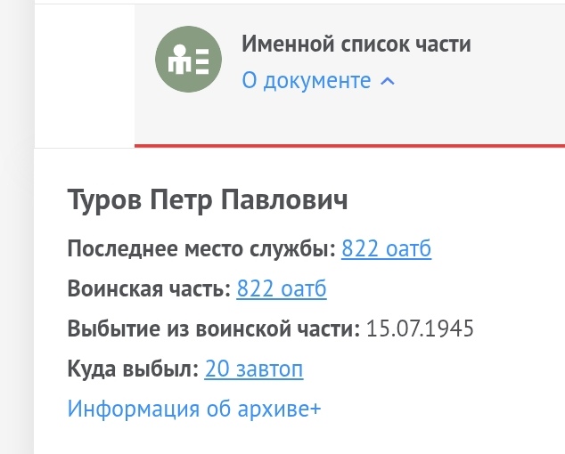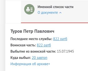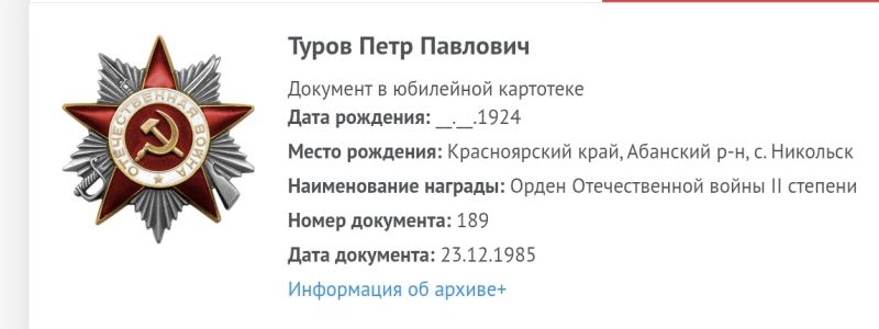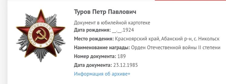 Туров Петр Павлович, 1924 г. р. Место рождения Красноярский край, Абанский район, с. Никольск. Семья репрессирована в 1928 году. В 1932 году высланы в Богучанский район, д. Мунтуль. Призван Богучанским РВК в 1942 году. Мл. сержант. Стрелок. В/ч 94 сд (п/п 354)., 822 оатб, 20 завтоп. Ранен в марте 1944 года. ЭГ 1559 (по справочнику Солдат. ру дислокация Азербайджанская ССР, Агдам). Награждён юбилейным орденом Отечественной войны 2 степени. Отец Туров Павел Иванович, мать Ирина Ал.
