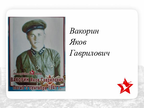 Один из старшых братьев моей бабушки, Вакорины Таисьи Гавриловны, Вакорин Яков Гаврилович, добровольно поступил на службу, в советскую армию, для защиты нашего отечества. 3 сентября 1941-го года он героически погиб, защищая нашу родину. Вечная ему память, царство небесное. Его братья встретили великую победу над фашитской Германией, в здравии, с красным знаменем над Рейхстагом. Вечная им память. Память всем советским солдатам.