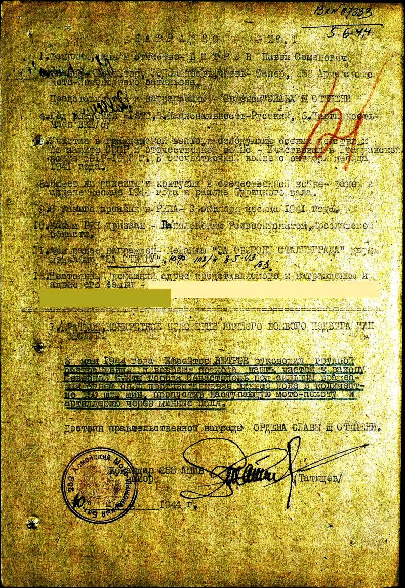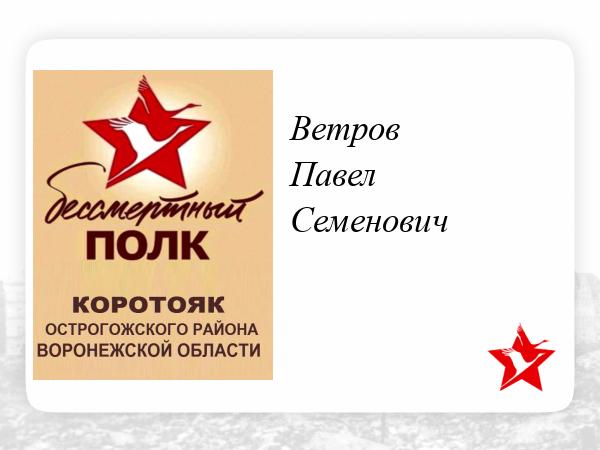 Павел Семенович ефрейтор сапер 258 армейского моторизованного инженерного батальона 31 гвардейского стрелкового корпуса воевал на Южном, 4 Украинском фронтах. Участвовал в боях под Севастополем, в районе Турецкого вала был ранен в апреле 1944 года. Есть документ от 7.09.1944 года о том, что Ветров Павел Семенович был отправлен из госпиталя №2891 в военно-пересылочный пункт СПП Раменского ГВК и дальше продолжал службу в в/ч п/п 55390.