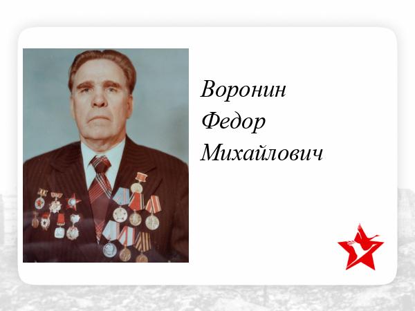 Едва Федору Михайловичу исполнилось 18 лет, как 16 сентября 1942 года он был призван в Красную Армию. Юный патриот готов был сражаться за свою Родину. Попал он в 202 гвардейский стрелковый полк 68-й гвардейской стрелковой дивизии 4-й гвардейской армии. Долгое время в резерве Верховного Главнокомандования и наконец 25 августа 1943 года полки 68 гвардейской пошли в наступление в составе Воронежского фронта. В начале сентября Федор Михайлович принимает боевое крещение у села Михайловка-Первая Котельвского района Полтавской области. С 14 по 23 сентября его полк прошел с боями к Днепру через Лубны, Пирятин и Яготин и в ночь на 24 число вышли к Днепру у деревни Яшинки. Форсирование могучей реки происходило в исключительно трудных условиях. С 24 сентября полк Федора Михайловича ведёт на Букринском плацдарме у села Балыко-Щучинка в составе 40-й армии, находясь под постоянным пулеметным и артиллерийским огнем. На Букринском плацдарме телефонист Воронин будучи в звании младшего сержанта проявил себя отважным бойцом своей Родины и 2 ноября 1943 года был награждён орденом Красной Звезды. Первого декабря 68-я гвардейская дивизия передана 38 армии. После небольшого перерыва, дивизия снова вступила в бои по освобождению Правобережной Украины. Федор Михайлович принимал участие в освобождении Бердичева в январе 1944 года. Но 9 января младший сержант Воронин получает тяжёлое правой ноги. Наступило тяжёлое время для героя долгие операции сначала в полевом госпитале, затем в Ленинграде и московской больнице Эрисмана. Ногу ампутировали по колено, 24 января 1945 года Федор Михайлович был демобилизован. Во время пересылок в больнице, тыловики потеряли орден Красной Звезды который достался ему за доблесть и отвагу, потеряли заявление в партию. Герою было всего 20 лет...