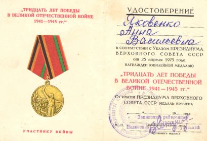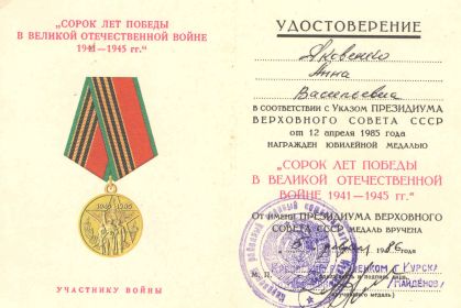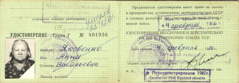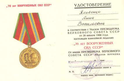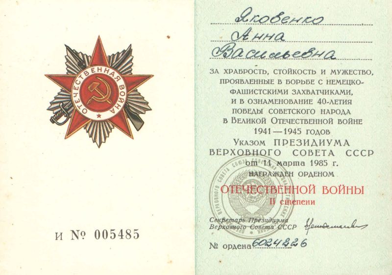 Яковенко Анна Васильевна. Родилась в семье сапожника. Была призвана в армию в 1943 году, служила телефонисткой в карпатских горах. Была демобилизована в апреле 1945 года.