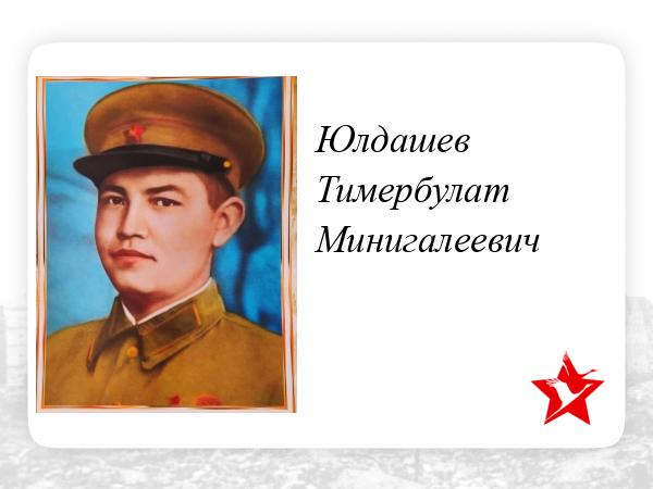 Дедушка Юлдашев Тимербулат Минигалеевич был призван в Красную Армию в 1939 году, служил пограничником на Советско-румынской границе. Родился в 1915 году в деревне Каранай Стерлибашевского района, работал учителем до войны.Младший лейтенант был назначен комсоргом батальона, закончил войну лейтенантом в Одессе, вернулся в 1946.