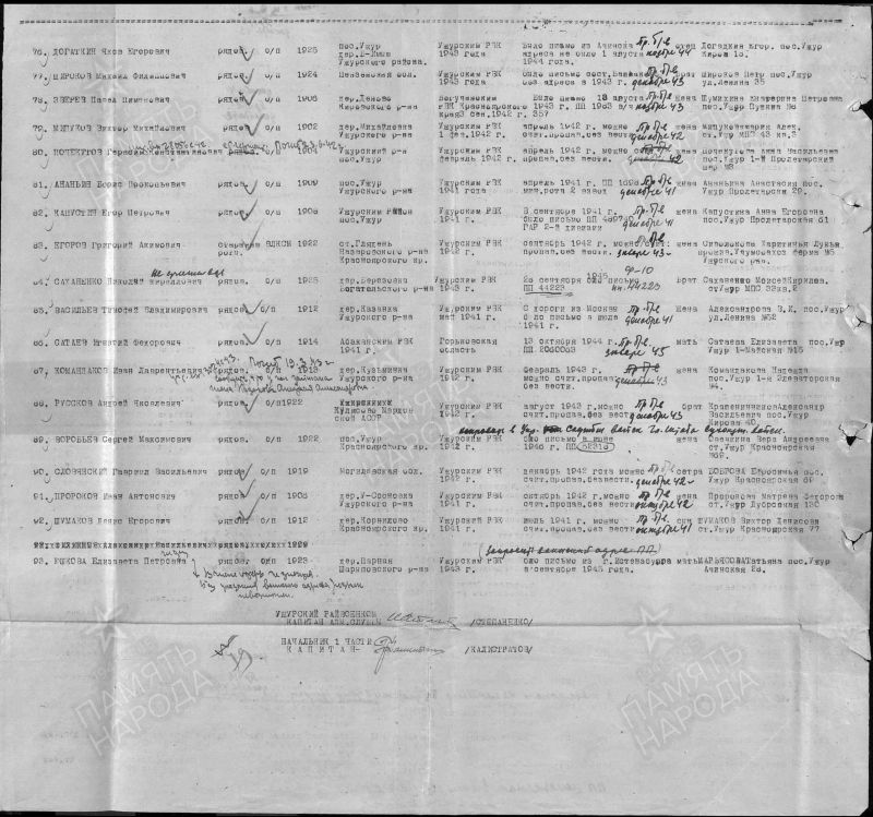 Зверев Павел Пименович, 1906 г. р. Место рождения Красноярский край, Пировский район, д. Доново. Призван Богучанским РВК в 1942 году. Красноармеец. Стрелок. Последнее письмо родные получили 18.08.1943 года. П/п 1983 в/ч 357. Пропал без вести в ноябре 1943 года. Жена Шумихина Екатерина Петровна в 1947 году проживала в г. Ужур Красноярского края.