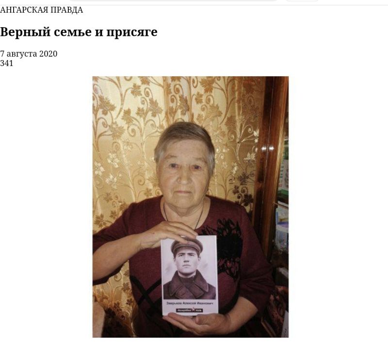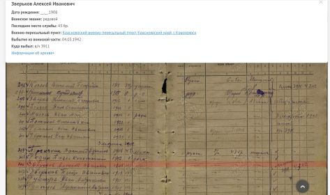 Зверьков Алексей Иванович, 1908 г. р. Место рождения Красноярский край, Богучанский район, д. Малеево. Призван Богучанским РВК в 1942 году. Красноармеец. Стрелок. В/ч 43 зсбр. Писем после призыва не было. Признан пропавшим без вести в декабре 1942 года. Жена Зверькова Антонида Ананьевна.