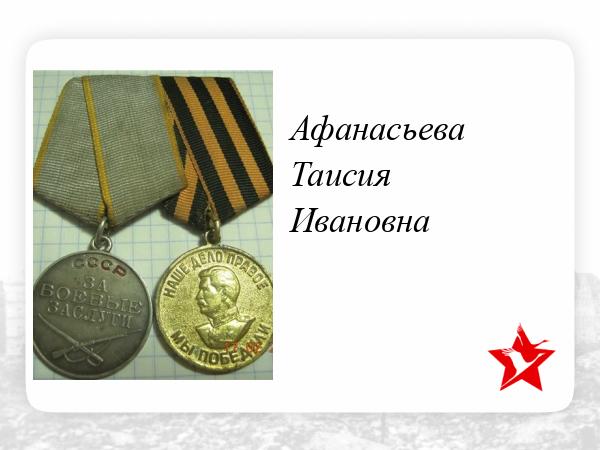 Афанасьева Таисия Ивановна -сержант, командир отделения разведки 267-й батареи СОН-2(службы оповещения и набледения) 197-го Отдельного Зенитно-Артиллерийского дивизиона 14-го Корпуса ПВО. В ВОВ с 04.43г.За мужество награждена медалью "ЗА БОЕВЫЕ ЗАСЛУГИ" от 31.03.45г. "За Победу над Германией". Знаком "Отличник ПВО". Есть журнал боевых действий.