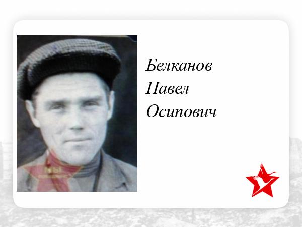 Мой дедешка Белканов Павел Осипович (Иосипович) родился в селе Огнево Свердловской области в простой семье. К сожалению не знаем сколько детей было в семье, ( по рассказам бабушки - у дедушки было ещё 8 братьев и сестёр).