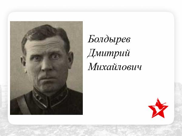 Гвардии подполковник БОЛДЫРЕВ ДМИТРИЙ МИХАЙЛОВИЧ, 4.10.1900 года рождения, место рождения - РОССИЙСКАЯ ИМПЕРИЯ, Тамбовская губерния, Борисоглебский уезд, уездный город Борисоглебск (по административному делению: 1. СССР: РСФСР, Воронежская область, Борисоглебский район, город Борисоглебск; 2. РОССИИ: Воронежская область, Борисоглебский городской округ город Борисоглебск), русский. Год призыва в РККА: 4.1918. Образование: 1. Гражданское (общее): Школа (в ?г.); 2. Военное: ?. В Великой Отечественной войне, с 4.00 22.06.1941 года, в должностях: 1. Командира 144 кавалерийского полка, 36 кавалерийской ордена Ленина Краснознамённой ордена Красной Звезды дивизии имени товарища И. В. Сталина, 6 казачьего кавалерийского корпуса имени И. В. Сталина, 10 Армии, Западного фронта; 2. Начальник штаба 11 гвардейской казачьей кавалерийской Донской Волновахской Краснознамённой ордена Богдана Хмельницкого дивизии, 5 гвардейского казачьего кавалерийского Донского Будапештского Краснознамённого корпуса, 3 Украинского фронта. Награды: 1. Ордена: “ЛЕНИНА” (30.04.1945), “ОТЕЧЕСТВЕННОЙ ВОЙНЫ” 1 СТЕПЕНИ (19.04.1945); 2. Медаль “ЗА ПОБЕДУ НАД ГЕРМАНИЕЙ В ВЕЛИКОЙ ОТЕЧЕСТВЕННОЙ ВОЙНЕ 1941 - 1945 ГГ.”. Вернулся с Великой Отечественной войны. Уволен в запас: 20.09.1945 года. Послевоенная судьба: неизвестна. Родственники: адрес неизвестен.