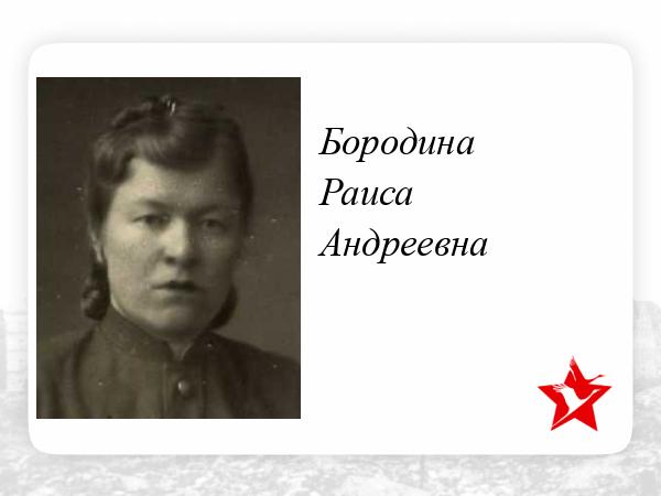 Из наградного листа от 7 марта 1945 года: «... младший лейтенант медицинской службы БОРОДИНА Р. А. работает в госпитале с первых дней войны. Как старшая медицинская сестра относится исключительно добросовестно к порученной работе. Своим чутким и внимательным отношением к раненным, своей заботой к порученному делу проявляет пример личному составу. Пользуется уважением и любовью со стороны раненных. Тов. Бородина является активным донором. Она сдала кровь 14 раз в количестве 4500 грамм, тем самым спасла жизнь многим раненым. Достойна представлении к правительственной награде орден «КРАСНАЯ ЗВЕЗДА».