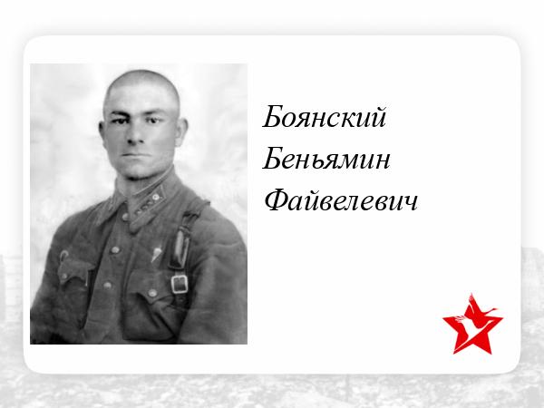 Капитан БОЯНСКИЙ БЕНЬЯМИН (БЕНТИЯН) ФАЙВЕЛЕВИЧ (ФАЙВОВИЧ), 8.08.1912 года рождения, место рождения - РОССИЙСКАЯ ИМПЕРИЯ, Витебская губерния, Лепельский уезд, уездный город Лепель (по административному делению: 1. СССР: Белорусская ССР, Витебская область, Лепельский район, г. Лепель; 2. РЕСПУБЛИКИ БЕЛАРУСЬ: Витебская область, Лепельский район, г. Лепель), еврей. Год призыва в РККА: 1932. Образование: 1. Гражданское (общее): Школа (в ?г.); 2. Военное: ? В Великой Отечественной войне, с 28.06.1941 года, в должности (последняя): Начальника штаба 407 стрелкового полка, 108 стрелковой дивизии, 44 стрелкового корпуса, 13 армии, Западного фронта. 8.07.1941 года, пленён: Белорусская ССР, Минская область, Столбцовский район, в районе села Рубежевичи (в н. вр.: РЕСПУБЛИКА БЕЛАРУСЬ: Минская область, Столбцовский район, агрогородок Рубежевичи). В плену (назвал: 1. Имя: Борис; 2. Отчество: Фёдорович; 3. Воинское звание: старший лейтенант; 4. Действительное наименование воинской части (общевойсковой номер, штатное наименование): 407 артиллерийский полк): 1. Stalag 307 Демблин (Dęblin), дистрикт Люблин (Distrikt Lublin), Генерал-губернаторство Польша (Generalgouvernement Рolen), Третий Рейх (Das Dritte Reich); в. н. вр.: г. Демблин (Dęblin), Рыцкий повят (Powiat rycki), Люблинское воеводство (Województwo lubelskie), РЕСПУБЛИКА ПОЛЬША (Rzeczpospolita Polska); 2. Oflag 62 (XIII D) Hammelburg, военный округ XIII – Нюрнберг (Nürnberg), Бавария (Bayern), Третий Рейх (Das Dritte Reich); в н. вр.: г. Хаммельбург (Hammelburg), район Бад-Киссинген (Bad Kissingen), административный округ Нижняя Франкония (Unterfranken), федеральная земля Бавария (Bayern), ФРГ (Bundesrepublik Deutschland), лагерный №2476. Выявлен, как еврей. Передан гестапо 10.09.1941 года. Расстрелян, после 10.09.1941 года, на учебном стрелковом полигоне школы снайперов СС, в качестве "живой мишени", под г. ХЕБЕРТСХАУЗЕН (Hebertshausen), Бавария (Bayern), Третий Рейх (Das Dritte Reich); в н. вр.: г. Хабертсхаузен (Hebertshausen), район Дахау (Dachau), федеральная земля Бавария (Bayern); Свободное государство Бавария (Freistaat Bayern), ФРГ (Bundesrepublik Deutschland). В списке Маргариты Котиковской порядковый №78. Родственники: РСФСР: 1. Смоленская область, Вяземский район, г. Вязьма, площадь Советская, дом 10, кв. №4, Боянскому Фёдору (Файвелу?); 2. Чкаловская область, город областного подчинения Новотроицк, сестра - Боянская Т. Ф.