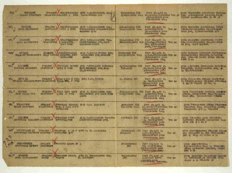 Гвардии майор БРУСКОВ ИВАН ГРИГОРЬЕВИЧ, 28.12.1905 года рождения, место рождения - РОССИЙСКАЯ ИМПЕРИЯ, Уфимская губерния, Златоустовский уезд, уездный город Златоуст (по административному делению: 1. СССР: РСФСР, Челябинская область, Златоустовский район, г. Златоуст; 2. РОССИИ: Челябинская область, Златоустовский городской округ). В РККА призван 06.1941 года. Образование: 1. Гражданское (общее): Ленинские курсы при ЦК КПСС. Трудовая деятельность: Токарь по металлу механического завода (07.1917 – 09.1932); Старший мастер механического цеха завода Уралмаш (09.1932 – 09.1937); Первый секретарь Чернушинского РК ВКП(б) (09.1937 – 11.1939); Первый секретарь Нытвенского РК ВКП(б) (11.1939 – 06.1941). В Великой Отечественной войне c 07.1941 года в должности (последняя): Заместителя по политической части командира 6 гвардейской маханизированной бригады, 2 гвардейского механизированного корпуса, 2 гвардейской армии, Южного фронта. Награды: 1. Орден “ЛЕНИНА” - ПОСМЕРТНО (10.1943). С Великой Отечественной войны не вернулся: 27.01.1943 года, убит, в бою. Захоронен (в настоящее время): РОССИЯ, Ростовская область, Аксайский район, сельское поселение Старочеркасское, хутор Рыбацкий, ул. Береговая, 29, 10 м. в восточном направлении, братское воинское захоронение. Родственники: РСФСР, Челябинская область, г. Челябинск, 2-ой городок НКВД, жена - Брускова Валентина Ивановна.