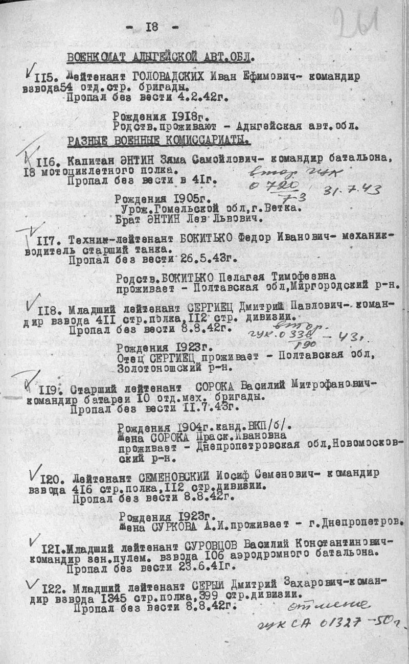 1. 18 мотоциклетный полк; 13 механизированный корпус; “Механизированные корпуса РККА в бою: История автобронетанковых войск Красной Армии в 1940-1941 годах.” ("CoolLib", автор Евгений Федорович Дриг: https://surl.li/utwuvw ); “Мотоциклетные части Красной Армии", автор Дриг Евгений Фёдорович (”Форум RKKA.RU": http://www.vif2ne.ru/rkka/forum/arhprint/38824 ); уточнение поисковика Геннадия Чернакова в отношении командно - начальствующего состава: 1. Правильного написания фамилии, имени, отчества; 2. Года: рождения, смерти, пропажи без вести; 3. Военной судьбы: