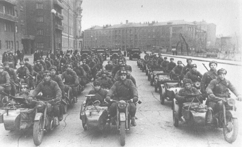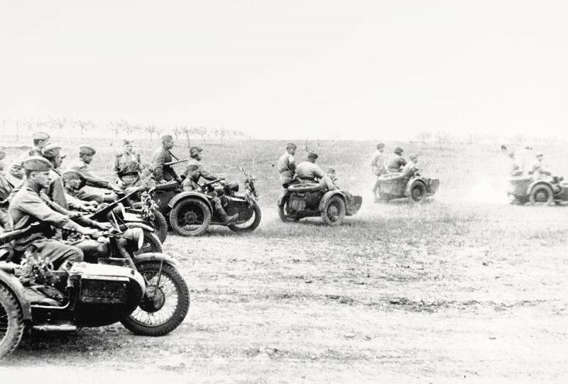 - “Взвод советских мотоциклистов, на мотоциклах М-72, на марше. Предположительно, снимок сделан под Одессой.”;