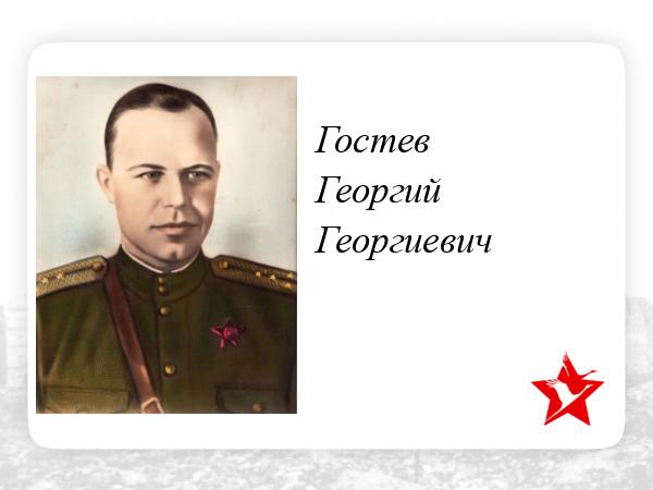 В боях 15 и 16.09.44 г. южнее населенного пункта Иецава в Латвии уничтожил 4 пушки, 10 пулеметных точек, 1 танк Т-3, бронетранспортер, более 120 солдат и офицеров противника. 19.09.44г. восточнее населенного пункта Текава в тяжелых условиях боя отразил своим танком две контратаки роты немцев, уничтожив 18 гитлеровцев. В период 3-ей контратаки был убит. Захоронен: Латвия / Балдоне / село Межвиды / Воинское братское кладбище. Гостев Георгий Георгиевич - командир танковой роты 7гвардейской механизированной бригады, 43 танкового полка, 3гвардейского механизированного корпуса награжден правительственной наградой - орденом "ОТЕЧЕСТВЕННАЯ ВОЙНА 1 СТЕПЕНИ" Пр.№27/Н от 22.10.1944г. (посмертно). Пр.№32/Н от 15.05.42г. был награжден орденом "КРАСНАЯ ЗВЕЗДА".