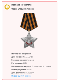 Указом Президиума Верховного Совета СССР от 29 июня 1945 года за исключительное мужество, отвагу и бесстрашие, проявленные на заключительном этапе Великой Отечественной войны в боях с гитлеровскими захватчиками гвардии старшина Исабаев Темиргали награждён орденом Славы 1-й степени. Исабаев Темиргали – разведчик 108-й отдельной гвардейской разведывательной роты (2-я гвардейская стрелковая дивизия, 2-я гвардейская армия, 3-й Белорусский фронт), гвардии старшина – на момент представления к награждению орденом Славы 1-й степени. Один из немногих полных кавалеров, награждённых четырьмя орденами Славы. Родился 3 января 1920 года в сельхозартели «Сарой» Каратальского района Алматинской (в 1944—1956, 1967—1991 годах – Талды-Курганской) области Республики Казахстан в крестьянской семье. Казах. Окончил 7 классов. Трудился в колхозе. В 1940 году был призван в Красную Армию Каратальским райвоенкоматом. Участник Великой Отечественной войны с августа 1941 года. Боевое крещение получил на дальних подступах к Москве, стал наводчиком противотанкового ружья (ПТР). В сентябре получил тяжелое ранение и почти полгода провел в госпиталях. Летом 1942 года, после выздоровления, был направлен на Северный Кавказ. В боях под Моздоком бронебойщик Исабаев подбил 3 вражеских танка, но и сам был ранен. Каждый раз после госпиталя возвращался в другую часть. Весной 1943 года в составе 4-й гвардейской отдельной стрелковой бригады участвовал в Краснодарской наступательной операции. Был наводчиком станкового пулемета отдельного пулеметного батальона. В боях под станицей Крымская получил третье ранение. Был награжден медалью «За отвагу». Летом 1943 года бригада была переформирована в новое соединение -108 гвардейскую стрелковую дивизию. После госпиталя был направлен в другую часть. К концу 1943 года старший сержант Исабаев воевал в составе 166-го гвардейского стрелкового полка 55-й гвардейской стрелковой дивизии. Как имеющий три ранения награжден медалью «За отвагу». Участвовал в Керченско-Эльтигенской десантной операции, в боях за удержание плацдарма. 10 января 1944 года при высадке десанта со своим отделением быстро высадился на берег и при прорыве переднего края обороны противника с боем овладел траншеями. В 11 января отразил 4 контратаки гитлеровцев. Был ранен. Приказом по войскам Отдельной Приморской Армии (№110/н) от 18 января 1944 года старший сержант Исабаев Темиргали был награжден орденом Славы 3-й степени. Орден был вручен только после войны в 1961 году. (Возможной причиной не вручения могла быть ошибка в написании фамилии). Выписавшись после ранения, в свой полк не вернулся, был зачислен в 82-й гвардейский стрелковый полк (32-я гвардейская стрелковая дивизия, Отдельная Приморская армия). В составе полка бронебойщик гвардии сержант Исабаев отличился в боях за освобождение Крыма весной 1944 года. В начале апреля 1944 года боях на Крымском полуострове поразил из ПТР несколько целей, в том числе вражеского снайпера. 18 апреля 1944 года вблизи села Новые Шули (7 км юго-восточнее Севастополя) в числе первых ворвался в расположение противника. Гранатами забросал находившихся в траншее гитлеровцев, уничтожив 8 вражеских солдат. Был представлен к награждению орденом Славы вновь 3-й степени. Бои за Севастополь продолжались. При штурме Сапун-горы гвардии сержант Исабаев шел в первых рядах атакующих, ун