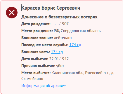 “Карасев Борис Сергеевич,1907 гр, д.Чебардино-Эткерово, Чувашской ССР. Лейтенант, призван 28.04.41г Невьянским РВК. Погиб 22.01.42г Калининская обл.. Ржевский р-он, д.Баямутово. Извещение от 22.05.57г ЦУП. Работал в лесничестве” стр. 257 книга"Память 1995г п.Верх-Нейвинск" автор Кукарцева Татьяна Ивановна. Занесен в книгу “Память 2025г г.Новоуральск” стр. 12, автор Ширяева Тамара Михайловна