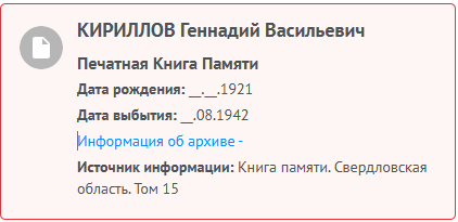 Уходя на войну 31 июля 1941г. из Верх-Нейвинска, секретарь комсомольской организации Геннадий Кириллов сказал, что « будет грудь в крестах или голова в кустах». Что с ним случилось, и как он погиб-неизвестно. Была только одна весточка из Краснодарского края, Тихорецкого района, станицы Новорождественской. Его друг сообщал , что Геннадий не имел права переписки, так как был заброшен в немецкий тыл. «Геннадий был настоящим патриотом нашей Родины!»-писал о нем с восхищением Михаил Лагачев. Полное молчание хранит всю жизнь о нем хозяйка хаты, где находился Геннадий. стр 92 книга “Идущая через века” автор Кукарцева Татьяна Ивановна.