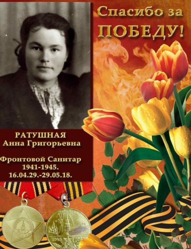 Я горжусь тем, что будучи в подростковом возрасте Ратушная Анна Григорьевна боролась против фашизма и ответственно выполняла работу фронтового санитара и выносила с поля боя раненых и оказывала им помощь, а так же копала окопы и выполняла посильную работу во имя Победы.