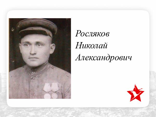 Росляков Николай Александрович брат моей бабушки - Росляковой (Салтыковой) Анны Александровны. На сайте Память народа датой его призыва считается март 1942 года, вероятно это подтверждено документами, но это не так. Великая Отечественная война началась для него в Риге, где он проходил срочную воинскую службу. Прошел всю войну. Был награжден медалями: “За боевые заслуги”, “За отвагу”, “За оборону Сталинграда”, “За победу над Германией в Великой Отечественной войне 1941–1945 гг.”. После войны жил и работал в Узловском районе Тульской области.