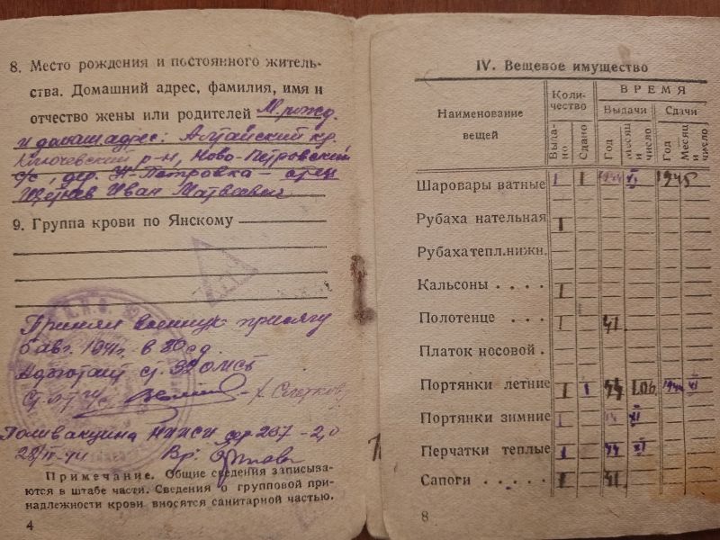 После войны дедушка женился на моей бабушке, у них родилось 4 детей. Правда старший сынок умер в детстве. Остальные дети-моя мама, её сестра и брат подарили моим дедушке и бабушке 8 внуков. Дедушка работал в совхозе, всегда занимал руководящие должности. Бабушка работала в столовой. Дедушка очень редко рассказывал про войну, очень не любил эти воспоминания