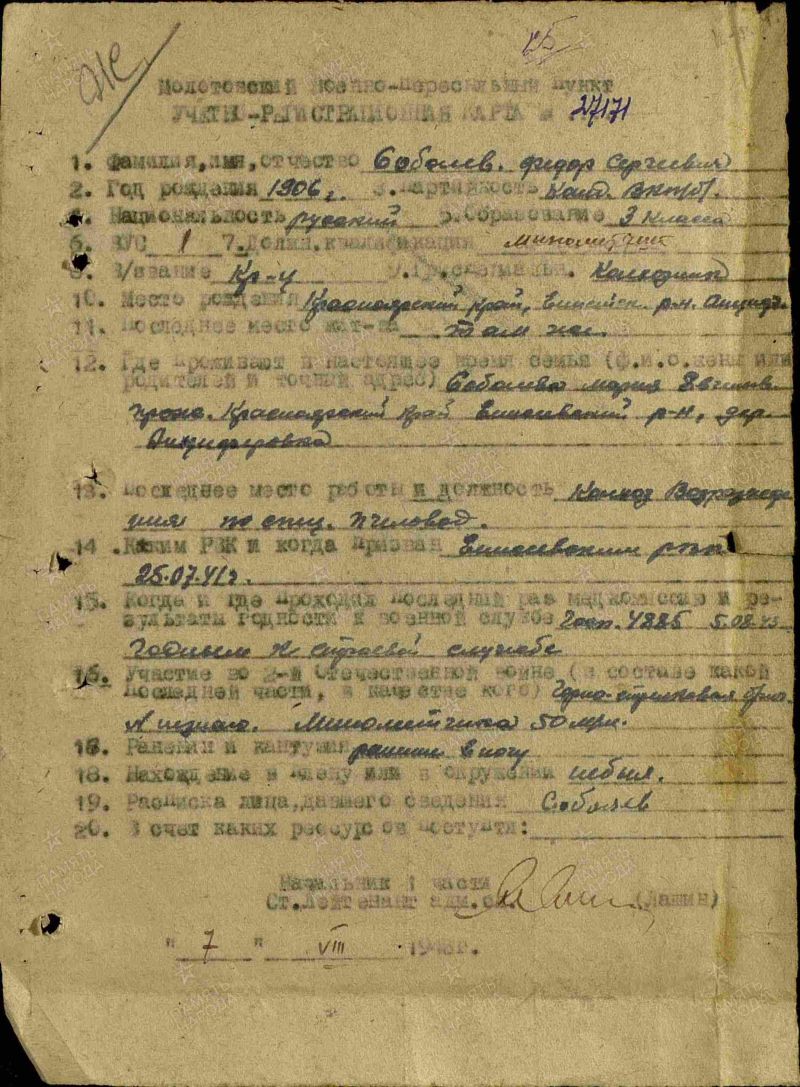 Соболев Федор Сергеевич, 1906 г. р. Место рождения Красноярский край, Енисейский район, с. Анциферово. Пчеловод. Призван Енисейским РВК в 1941 году. Красноармеец. Минометчик. Стрелок. В/ч горнострелковая бригада. Ранен в ногу в августе 1943 года. ЭГ 4885 (Молотовская область). В/ч 269 гв. сп 72 гв. сд. Ошибочно включён в списки безвозвратных потерь. Убит в бою 19.10.1943 года. Похоронен Украина. Днепропетровская область, Верхне-Днепропетровский район, с. Боровковка. Продолжал служить в в/ч 203 сп 92 сд. Тяжело ранен в грудную клетку 4.11.1943 года. Умер от ран 11.11.1943 года в ЭГ 265. Похоронен Украина. Харьковская область, г. Харьков, ст. Основа. Жена Соболева Мария Евгеньевна.