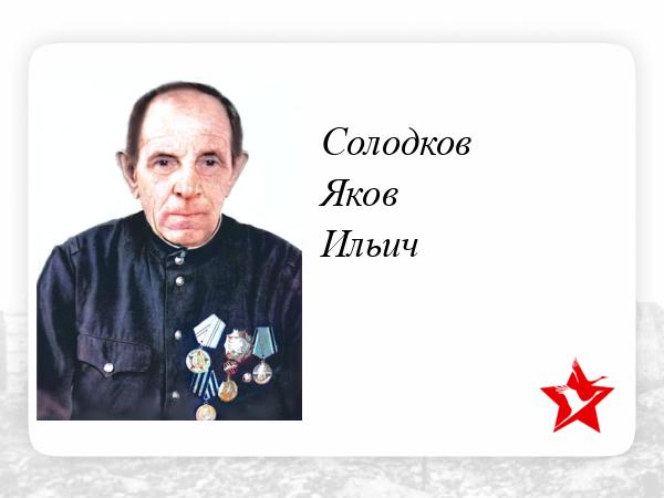 4-6 октября 1944 года в боях на западном берегу Нарева у деревни Тшепово Сероцкого уезда Варшавского воеводства Солодков Яков Ильич со своим взводом предпринял контратаку и оттеснил противника до высоты 108.0. При этом до 20 вражеских солдат и офицеров были уничтожены, ещё 1 попал в плен. В том бою Солодков получил ранение.