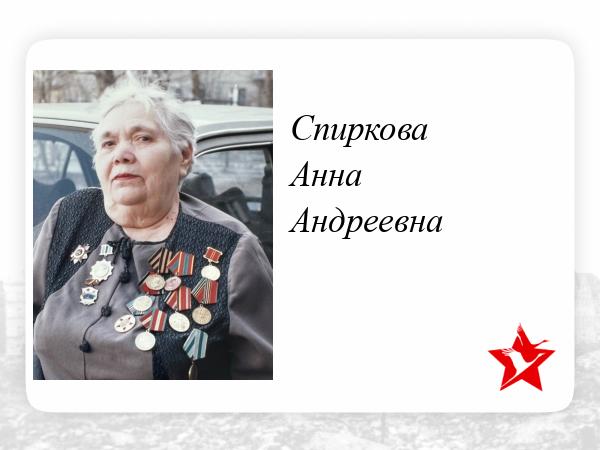 Спиркова А.А. Герой Великой Отечественной Войны - она завершила службу в 1944 году и была награждена множеством орденов и медалей. Одни из: За оборону Советского Заполярья, Орден Отечественной Войны II степени.