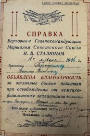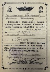Мне пришлось учавствовать в прорыве обороны немцев на западном берегу Вислы, южнее Варшавы, при переходе границы Германии, западнее города Познани и вторжение в пределы немецкой Померании. При прорыве сильно укрепленной обороны немцев, восточнее города Штаргард, в овладении городами Бельгард, Трептов, Грайфенберг, Каммин, Гюльцов, Плате- важными узлами коммуникаций и сильными опорными пунктами немцев в Западной Померании, в боевых действиях по овладению городами Гюллнов, Штепенитц и Массов- важными опорными пунктами к Штеттину, в овладении городом Альтдамм и ликвидации сильно-укрепленного плацдарма немцев на правом берегу реки Одер, восточнее Штеттина, в наступлении на Берлин. В завершении окружения города Берлин и в овладении городами: Науен, Эльшталь, Рарбек, Марквардт, Ратенов, Шпандау, Потсдам и в овладении 2 мая 1945 года столицей Германии-город Берлин. 7 мая 1945 года наша часть вышла к берегам реки Эльба на встречу с Американскими войсками.