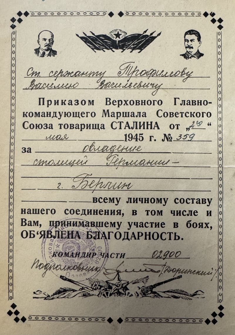 На этом война для меня закончилась. За боевые действия во время Великой Отечественной войны я получил от Верховного Главнокомандующего И.В. Сталина 11 благодарностей, награжден орденами: «Красного знамени» «Отечественной войны» 2 степени, «Славы» 3 степени, медалями: «За отвагу», «За боевые заслуги», «За взятие Берлина», «За освобождение Варшавы», «За победу над Германией» и другими. Значком «Отличный артиллерист»».