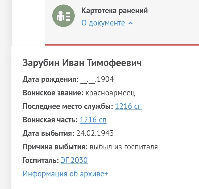 Зарубин Иван Тимофеевич, 1904 г. р. Место рождения Красноярский край, Богучанский район, с. Богучаны. Призван Богучанским РВК в 1942 году. Красноармеец. Стрелок. В/ч 1216 сп 364 сд., 265 сд. Тяжело ранен в феврале 1943 года. ЭГ 2030 (по справочнику Солдат. ру дислокация Ленинградская область). Комиссован по ранению в 1943 году.