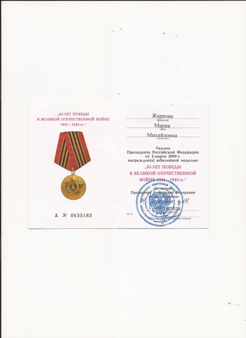 Моя тетя, Жаркова (Видьманова) Мария Михайловна родилась 8 августа 1920 года в селе Мартыновка, Асекеевского района, Оренбургской области. В годы Великой Отечественной Войны трудилась в тресте «Кемеровоуголь» согласно записи в трудовой книжке. По факту работала в Кемерово на военном заводе по производству пороха. Как назывался завод она не говорила, сказала только, что уже после войны завод стали называть производственное объединение «Прогресс». Работать было тяжело и страшно, но мы боролись со страхом, а тяжело было всем - так говорила моя тетя. Рассказывала, что на заводе был взрыв, погибли люди, но, когда и кто погиб никогда не говорила, видно «секретность» осталась с ней навсегда.